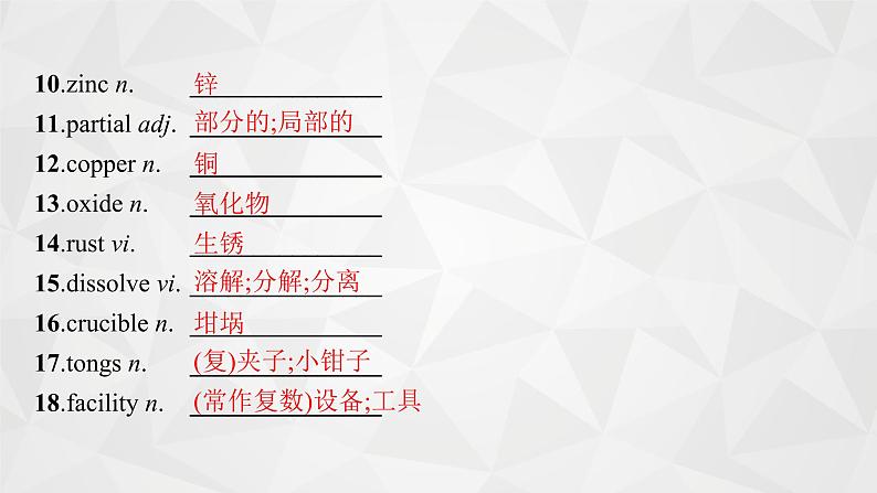10.zinc n._______________11.partial adj._______________12.cpper n._______________13.xide n._______________14.rust vi._______________15.disslve vi._______________16.crucible n._______________17.tngs n._______________18.facility n._______________