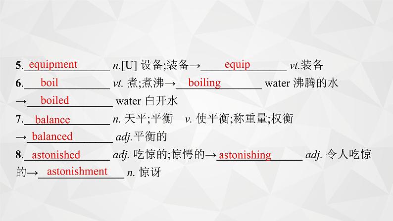5._______________ n.[U] 设备;装备→_______________ vt.装备 6._______________ vt. 煮;煮沸→_______________ water 沸腾的水→_______________ water 白开水 7._______________ n. 天平;平衡 v. 使平衡;称重量;权衡→_______________ adj.平衡的 8._______________ adj. 吃惊的;惊愕的→_______________ adj. 令人吃惊的→_______________ n. 惊讶