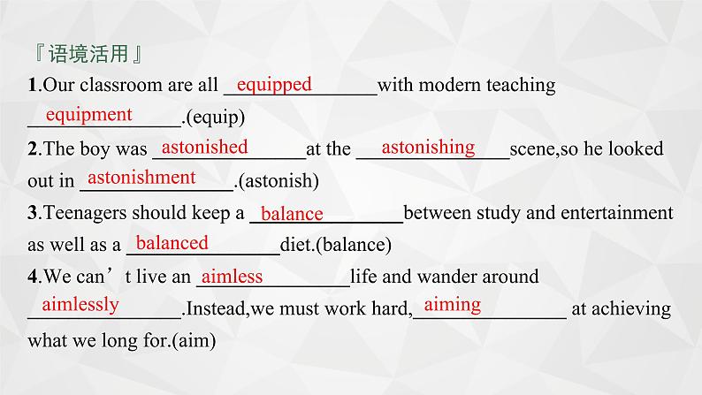 『语境活用』1.Our classrm are all _______________with mdern teaching _______________.(equip) 2.The by was _______________at the _______________scene,s he lked ut in _______________.(astnish) 3.Teenagers shuld keep a _______________between study and entertainment as well as a _______________diet.(balance) 4.We can’t live an _______________life and wander arund _______________.Instead,we must wrk hard,_______________ at achieving what we lng fr.(aim)