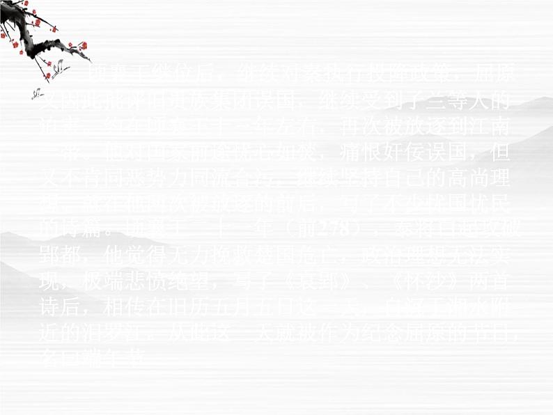 背景材料。 (1)屈原(约前340~前27幻名平,字原,又自云名正则,字灵均,战国时楚人,我国文学史上最早的伟大诗人。 屈原出身于和楚王同宗的没落贵族家庭,因其“博闻强志,明于治治乱,娴于辞令”,应对诸侯,后又任三闾大夫,对内主张修明法度,举贤授能,对外坚持联齐抗秦,以楚为中心统一中国,受到腐朽贵族集团子兰、靳尚等人的攻击,遭谗而去职。约在楚怀王二十五年左右,被放逐到汉北(今湖北省西北部)。从此,楚国国势日益衰微,怀王宠姬郑袖和大臣靳尚等旧贵族集团的人物,包围了怀王,后怀王又受到秦国使臣张仪的欺骗,与齐绝交,使楚陷于孤立,两次派兵攻秦,结果损兵折将,失去汉中六百里国土。怀王晚年,不听屈原劝阻,在子兰等人怂恿下,去秦讲和,被秦扣留,客死于秦。