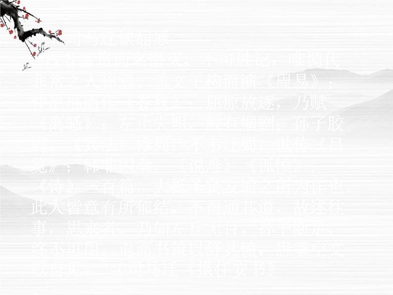 司马迁谈屈原------- “古者富贵而名磨灭,不可胜记,唯惆代非常之人称焉。盖文王构而演《周易》;仲尼厄而作《春秋》;屈原放逐,乃赋《离骚》;左止失明,厥有帼剧;孙子胶脚,《兵法》修列;不韦迁蜀,世传《吕览》;韩非囚秦,《说难》《孤愤》;《诗》三百篇,大抵圣贤发愤之所为作也。此人皆意有所郁结,不得通其道,故述往事,思来者。乃如左丘无目,孙子断足,终不可用,退而书策以舒其愤,思垂空文以自见。”(司马迁《报任安书》