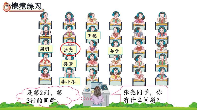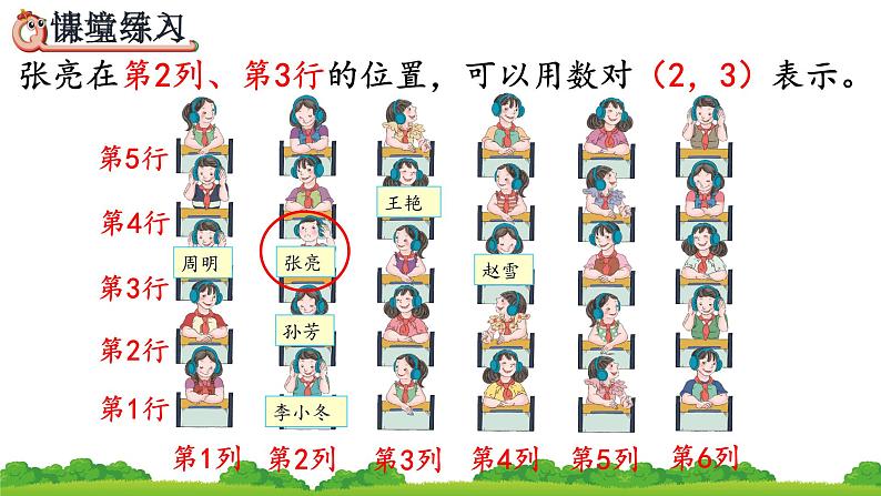 张亮在第2列、第3行的位置,可以用数对(2,3)表示。