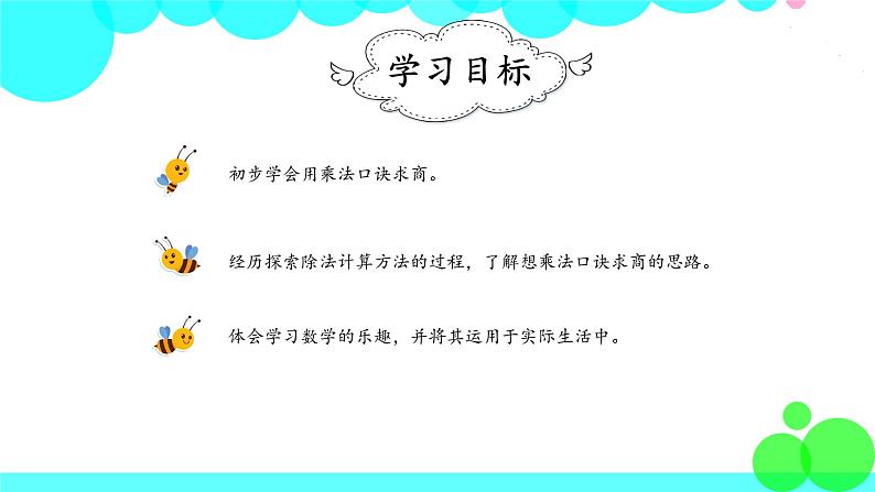 经历探索除法计算方法的过程,了解想乘法口诀求商的思路。