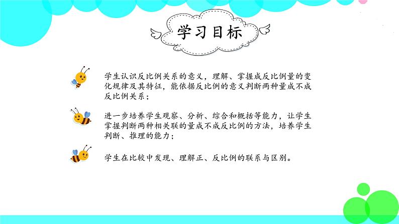 学生认识反比例关系的意义,理解、掌握成反比例量的变化规律及其特征,能依据反比例的意义判断两种量成不成反比例关系;