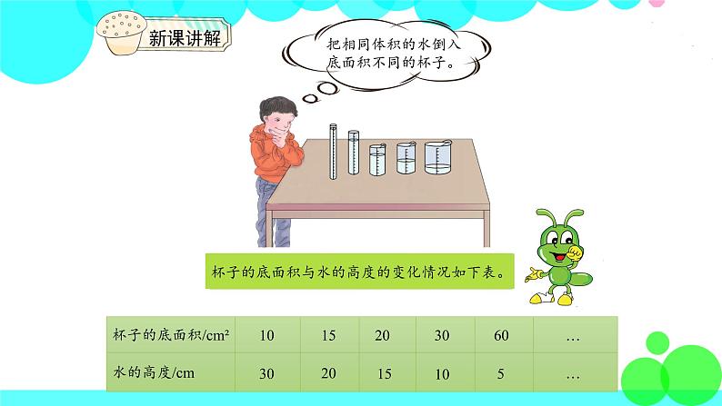 从上表可以看出,水的高度和杯子的底面积是两种相关联的量,水的高度是随着杯子的底面积的变大而不断变小的,而且水的高度与杯子的底面积的乘积总是一定的。