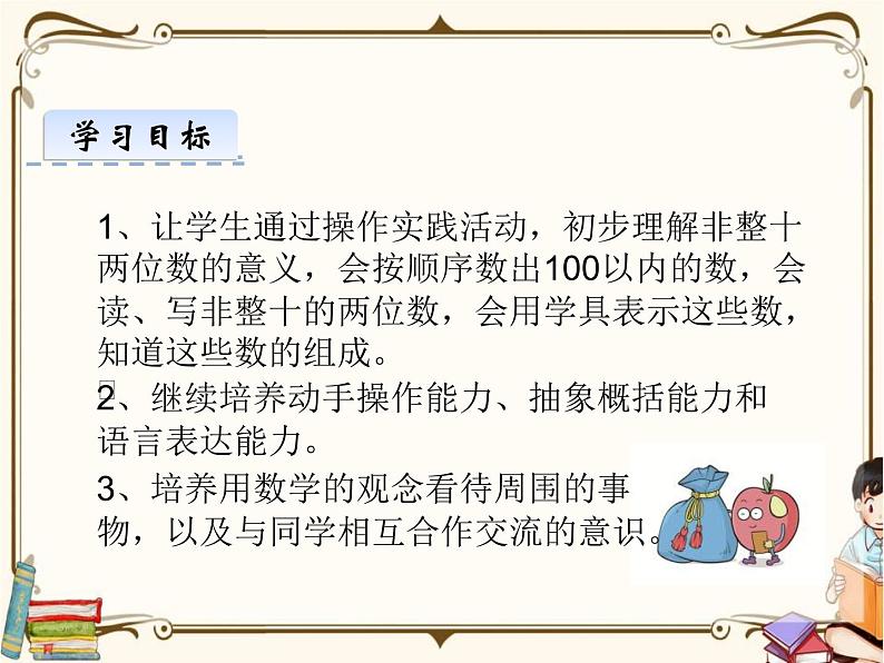 1、让学生通过操作实践活动,初步理解非整十两位数的意义,会按顺序数出100以内的数,会读、写非整十的两位数,会用学具表示这些数,知道这些数的组成。