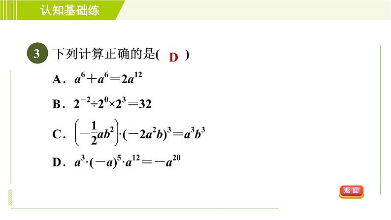 【教材P15随堂练习变式】【2021·遵义】下列计算正确的是( )A.a3·a=a3 B.(a2)3=a5C.4a·(-3ab)=-12a2b D.(-3a2)3=-9a6