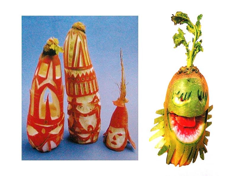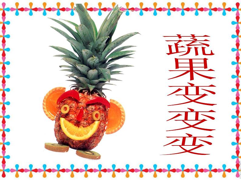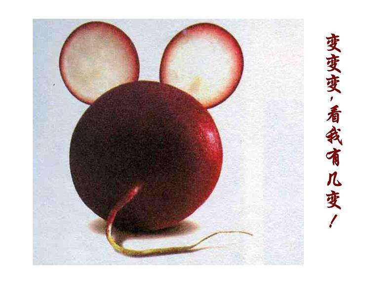 蔬果变变变,变变变,我是怎么变出来的?变变变,看我有几变?变变变,大家一起变!切、拼接、雕刻、