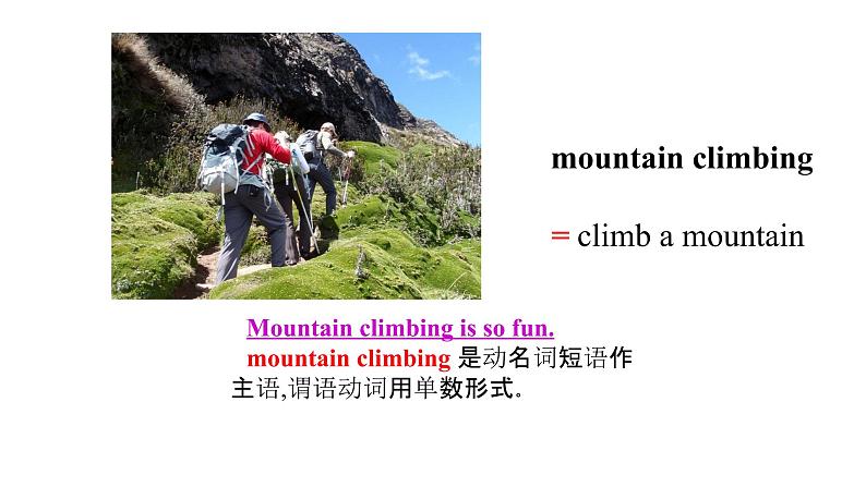 Muntain climbing is s fun. muntain climbing 是动名词短语作主语,谓语动词用单数形式。