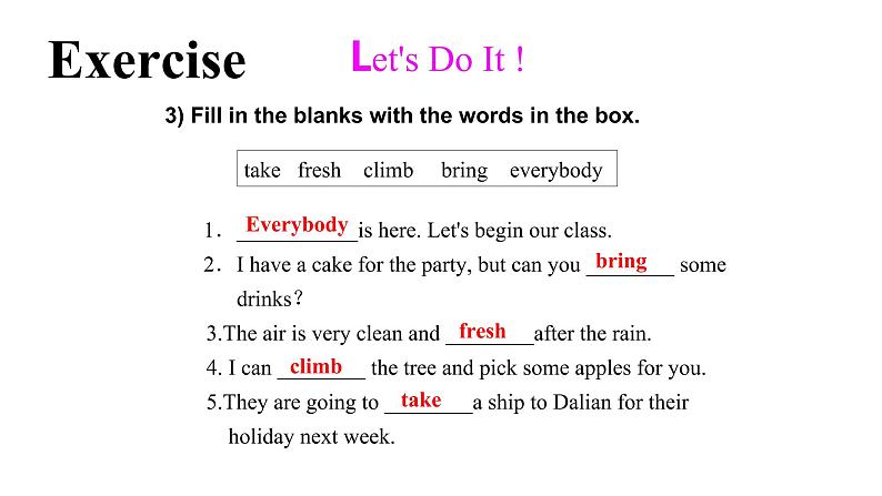 1.___________is here. Let's begin ur class. 2.I have a cake fr the party, but can yu ________ sme drinks? 3.The air is very clean and ________after the rain. 4. I can ________ the tree and pick sme apples fr yu. 5.They are ging t ________a ship t Dalian fr their hliday next week.