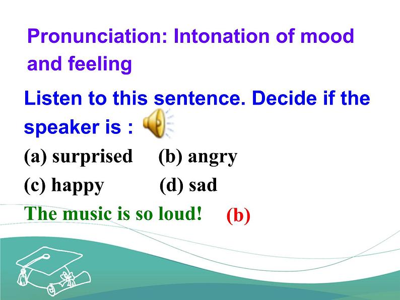 Listen t this sentence. Decide if the speaker is :(a) surprised (b) angry(c) happy (d) sadThe music is s lud!