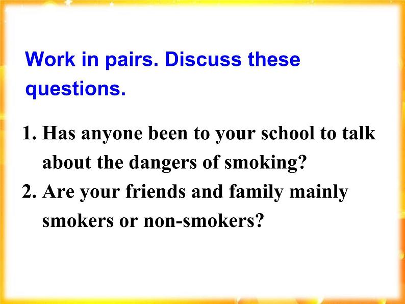 1. Has anyne been t yur schl t talk abut the dangers f smking?2. Are yur friends and family mainly smkers r nn-smkers?