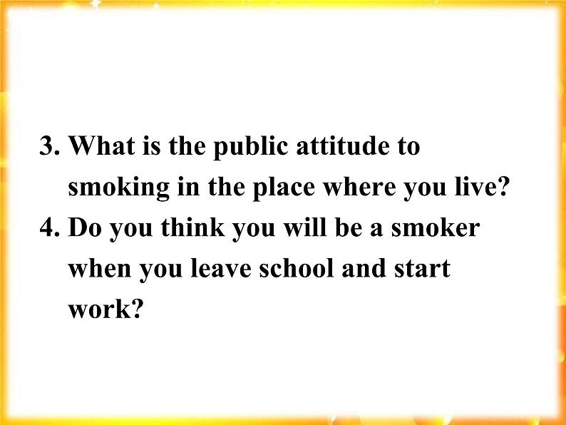 3. What is the public attitude t smking in the place where yu live?4. D yu think yu will be a smker when yu leave schl and start wrk?