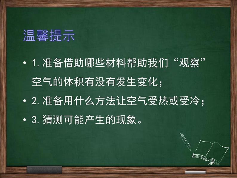 展开1.准备借助哪些材料帮助我们“观察”空气的体积有没有发生变化;2.准备用什么方法让空气受热或受冷;3.猜测可能产生的现象。
