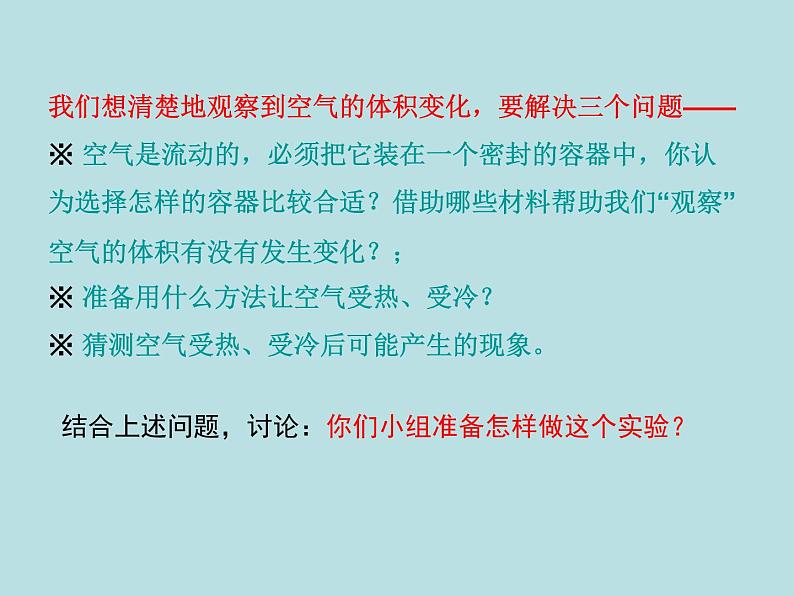 我们想清楚地观察到空气的体积变化,要解决三个问题——※ 空气是流动的,必须把它装在一个密封的容器中,你认为选择怎样的容器比较合适?借助哪些材料帮助我们“观察”空气的体积有没有发生变化?;※ 准备用什么方法让空气受热、受冷?※ 猜测空气受热、受冷后可能产生的现象。