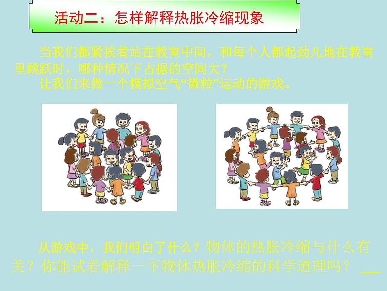从游戏中,我们明白了什么?物体的热胀冷缩与什么有关?你能试着解释一下物体热胀冷缩的科学道理吗?