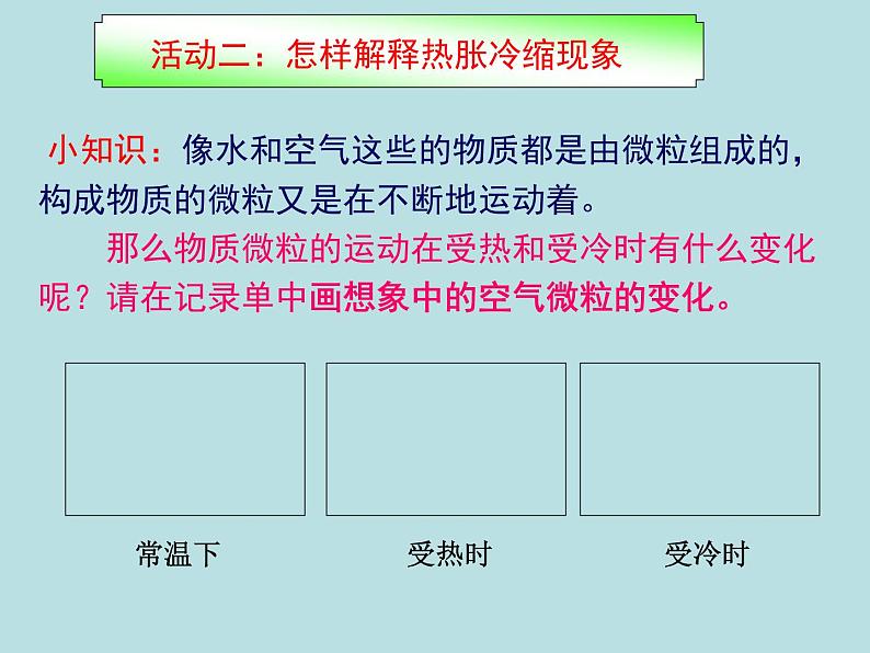 小知识:像水和空气这些的物质都是由微粒组成的,构成物质的微粒又是在不断地运动着。 那么物质微粒的运动在受热和受冷时有什么变化呢?请在记录单中画想象中的空气微粒的变化。