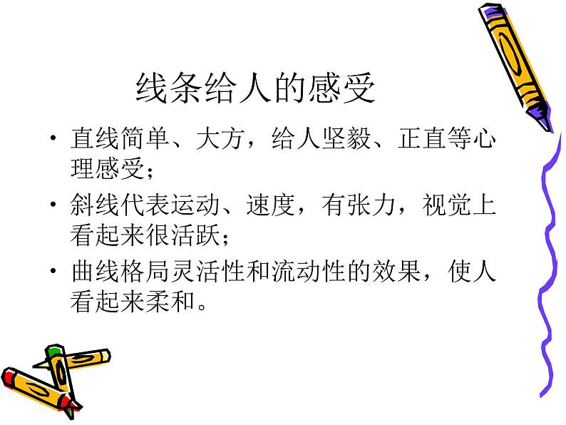 直线简单、大方,给人坚毅、正直等心理感受;斜线代表运动、速度,有张力,视觉上看起来很活跃;曲线格局灵活性和流动性的效果,使人看起来柔和。