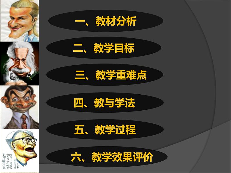 本课我教给学生学习肖像漫画的方法是:把握人物个性特点,抓住脸形、五官特征,我设计了如下六个环节: