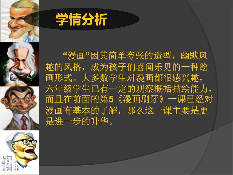 “漫画”因其简单夸张的造型,幽默风趣的风格,成为孩子们喜闻乐见的一种绘画形式。大多数学生对漫画都很感兴趣,六年级学生已有一定的观察概括描绘能力,而且在前面的第5《漫画刷牙》一课已经对漫画有基本的了解,那么这一课主要是更是进一步的升华。