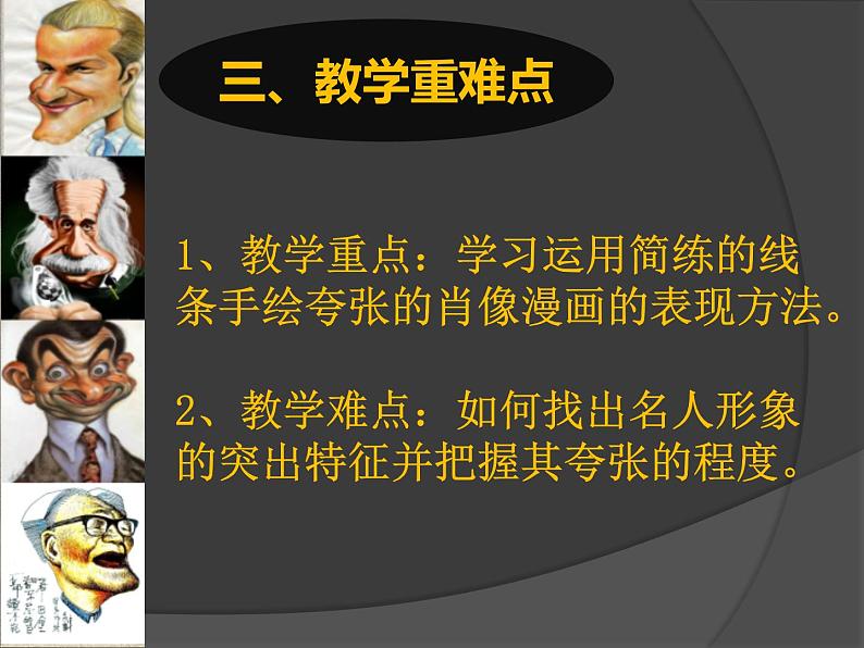 1、教学重点:学习运用简练的线条手绘夸张的肖像漫画的表现方法。 2、教学难点:如何找出名人形象的突出特征并把握其夸张的程度。