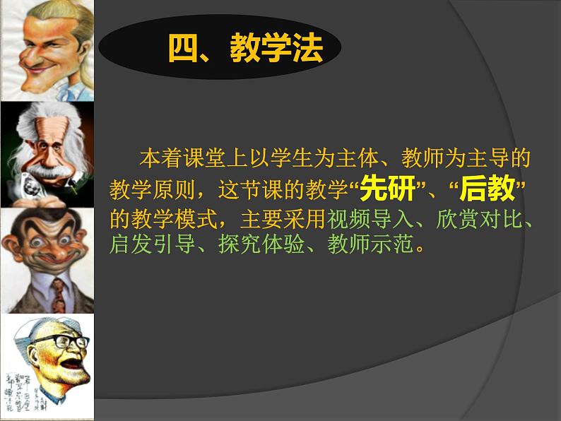 本着课堂上以学生为主体、教师为主导的教学原则,这节课的教学“先研”、“后教”的教学模式,主要采用视频导入、欣赏对比、启发引导、探究体验、教师示范。
