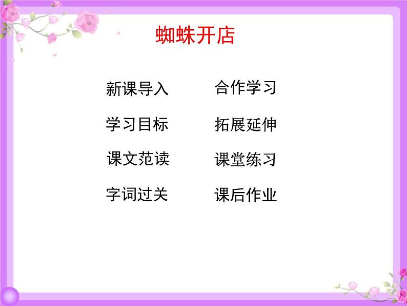 这是一份人教部编版二年级下册课文620 蜘蛛开店课堂教学ppt课件,共25页。PPT课件主要包含了蜘蛛开店,新课导入,课文范读,字词过关,课后作业,拓展延伸,合作学习,课堂练习,学习目标,孤单冷清等内容,欢迎下载使用。