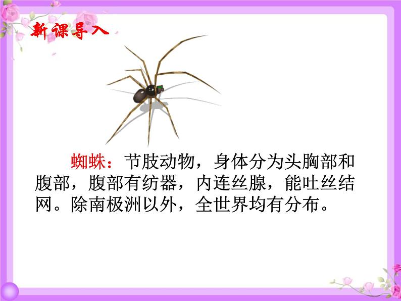 蜘蛛:节肢动物,身体分为头胸部和腹部,腹部有纺器,内连丝腺,能吐丝结网。除南极洲以外,全世界均有分布。