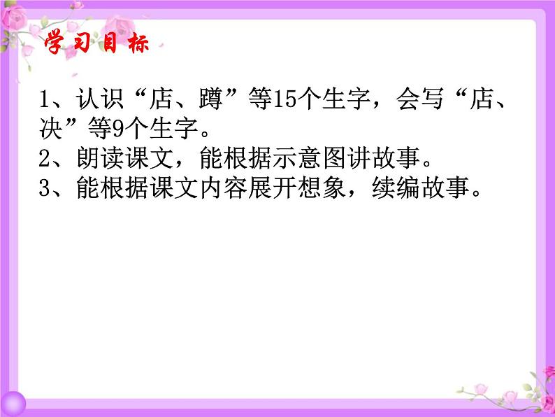 1、认识“店、蹲”等15个生字,会写“店、决”等9个生字。2、朗读课文,能根据示意图讲故事。3、能根据课文内容展开想象,续编故事。