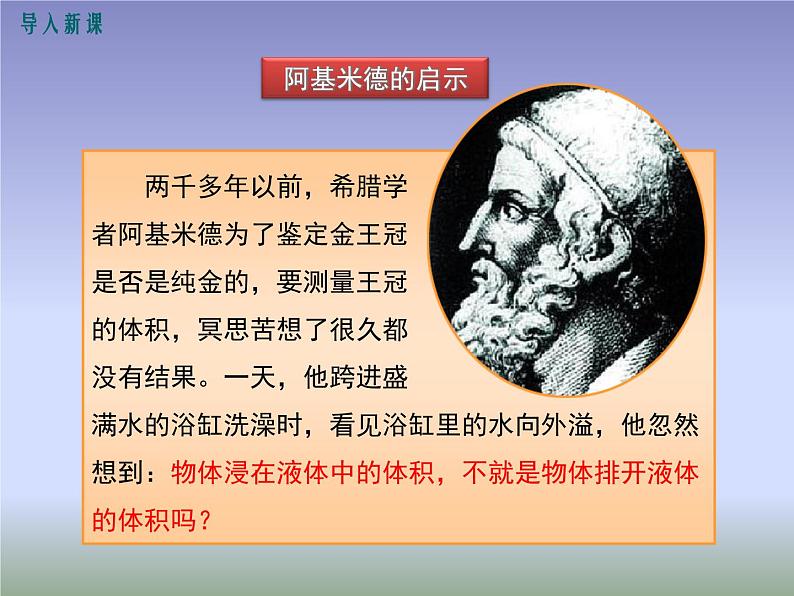 两千多年以前,希腊学者阿基米德为了鉴定金王冠是否是纯金的,要测量王冠的体积,冥思苦想了很久都没有结果。一天,他跨进盛满水的浴缸洗澡时,看见浴缸里的水向外溢,他忽然想到:物体浸在液体中的体积,不就是物体排开液体的体积吗?