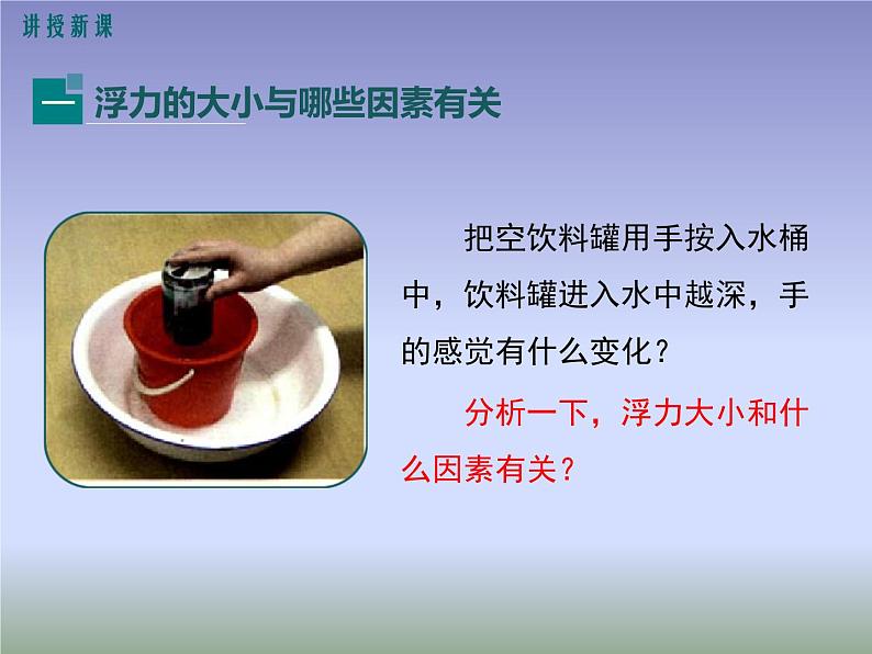 把空饮料罐用手按入水桶中,饮料罐进入水中越深,手的感觉有什么变化?