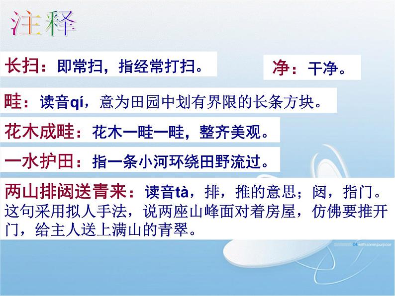 两山排闼送青来:读音tà,排,推的意思;闼,指门。这句采用拟人手法,说两座山峰面对着房屋,仿佛要推开门,给主人送上满山的青翠。