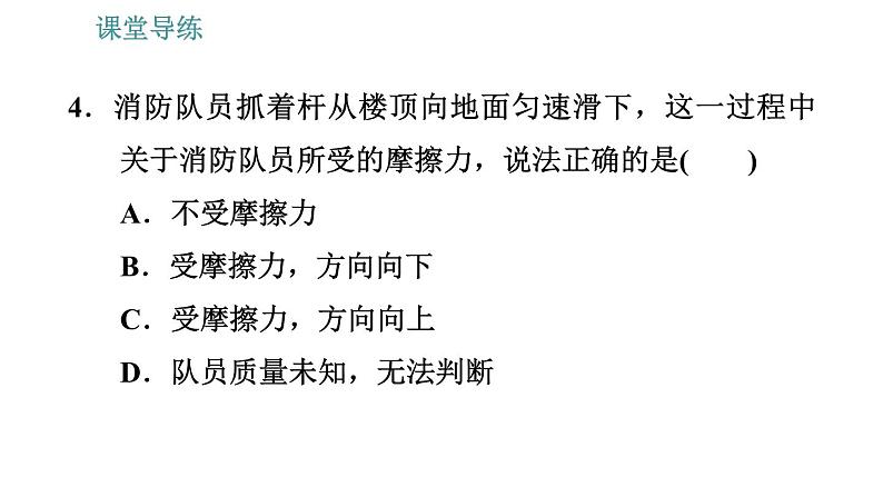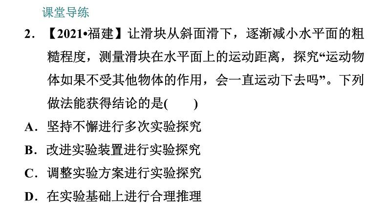【点拨】正在腾空而起的火箭,加速向上飞,因此火箭受到非平衡力的作用,A不符合题意;自由竖直下落的石子,由于重力作用做加速运动,因此受非平衡力作用,B不符合题意;沿光滑斜面下滑的木块,其速度越来越快,因此受非平衡力作用,C不符合题意;火车在平直轨道上沿直线匀速行驶时,速度的方向和大小均不变,因此受到平衡力的作用。