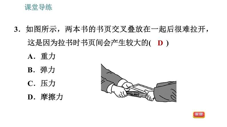 【点拨】G与F3这两个力没有作用在同一个物体上,所以不是一对平衡力,故A错误;G的施力物体是地球,受力物体是小球;F3的施力物体是水平横杆,受力物体是弹簧,所以G与F3不是一对相互作用力,故B错误;F1是弹簧拉动小球的力,F2是小球拉动弹簧的力,这两个力是一对相互作用力,故C错误、D正确。