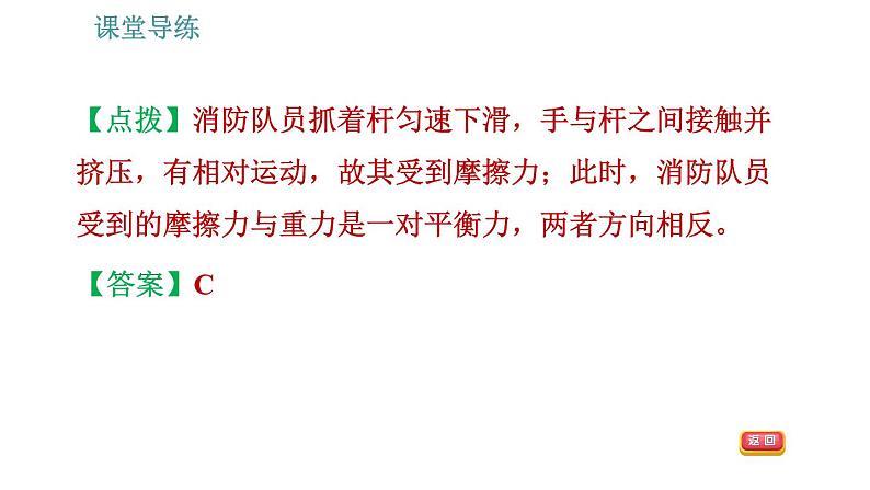 【点拨】因为人骑在自行车上,所以车的重力和地面对车的支持力大小不相等、方向相反、作用在同一直线上,不是一对平衡力,也不是相互作用力,故A、B错误;车对地面的压力和地面对车的支持力,大小相等、方向相反、作用在两个物体上,作用在同一条直线上,是一对相互作用力,故C正确;车的重力和车对地面的压力方向相同,故不是一对相互作用力,故D错误。