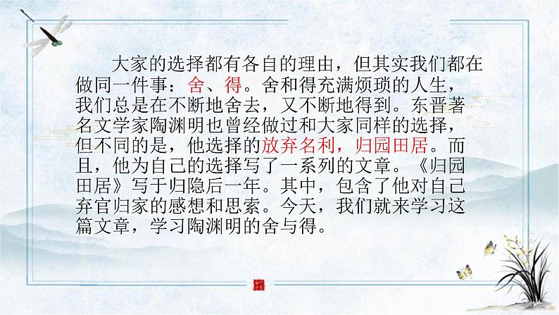 大家的选择都有各自的理由,但其实我们都在做同一件事:舍、得。舍和得充满烦琐的人生,我们总是在不断地舍去,又不断地得到。东晋著名文学家陶渊明也曾经做过和大家同样的选择,但不同的是,他选择的放弃名利,归园田居。而且,他为自己的选择写了一系列的文章。《归园田居》写于归隐后一年。其中,包含了他对自己弃官归家的感想和思索。今天,我们就来学习这篇文章,学习陶渊明的舍与得。