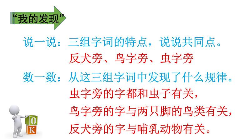 说一说:三组字词的特点,说说共同点。 反犬旁、鸟字旁、虫字旁数一数:从这三组字词中发现了什么规律。 虫字旁的字都和虫子有关, 鸟字旁的字与两只脚的鸟类有关, 反犬旁的字与哺乳动物有关。