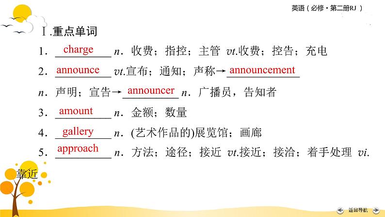 Ⅰ.重点单词1.__________ n.收费;指控;主管 vt.收费;控告;充电2.__________ vt.宣布;通知;声称→_____________ n.声明;宣告→__________ n.广播员,告知者3.__________ n.金额;数量4.__________ n.(艺术作品的)展览馆;画廊5.__________ n.方法;途径;接近 vt.接近;接洽;着手处理 vi.靠近