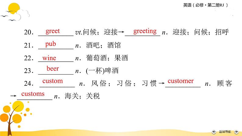 20.__________ vt.问候;迎接→__________ n.迎接;问候;招呼21.__________ n.酒吧;酒馆22.__________ n.葡萄酒;果酒23.__________ n.(一杯)啤酒24.__________ n.风俗;习俗;习惯→__________ n.顾客→__________ n.海关;关税