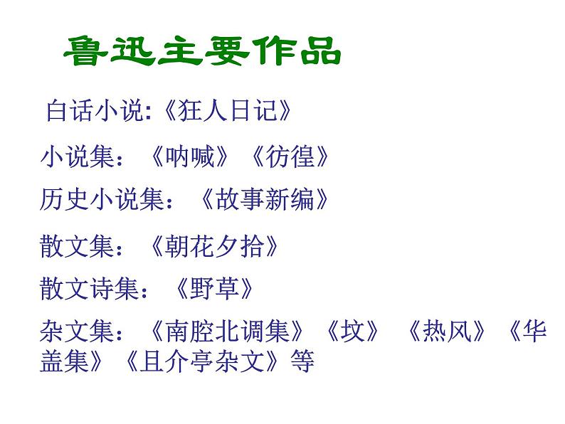 杂文集:《南腔北调集》《坟》 《热风》《华盖集》《且介亭杂文》等