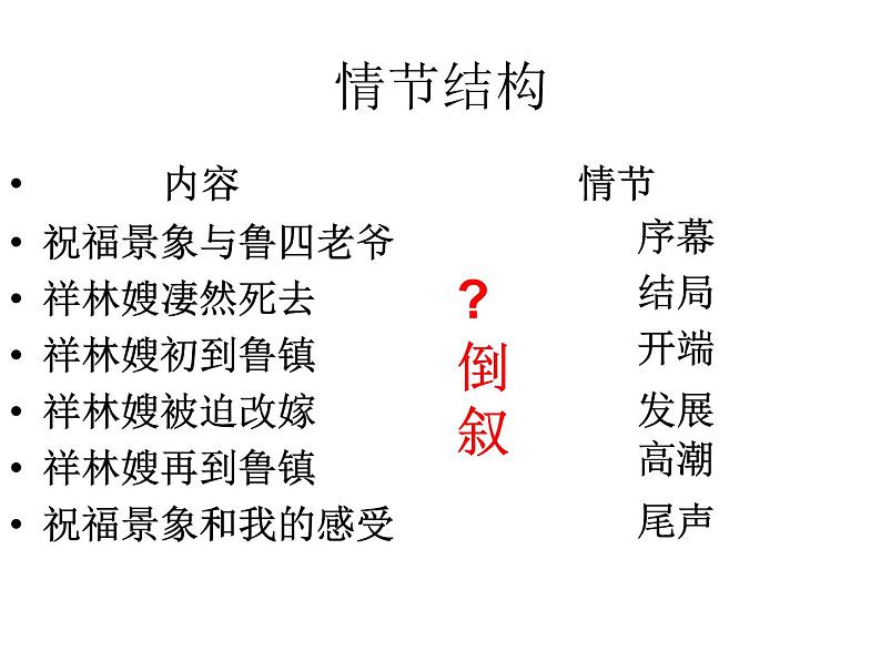 内容 情节祝福景象与鲁四老爷 祥林嫂凄然死去 祥林嫂初到鲁镇 祥林嫂被迫改嫁 祥林嫂再到鲁镇 祝福景象和我的感受