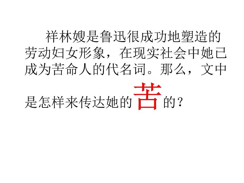 祥林嫂是鲁迅很成功地塑造的劳动妇女形象,在现实社会中她已成为苦命人的代名词。那么,文中是怎样来传达她的苦的?