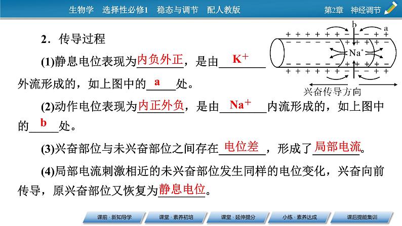 2.传导过程(1)静息电位表现为________,是由________外流形成的,如上图中的_____处。(2)动作电位表现为________,是由________内流形成的,如上图中的_____处。(3)兴奋部位与未兴奋部位之间存在________,形成了________。(4)局部电流刺激相近的未兴奋部位发生同样的电位变化,兴奋向前传导,原兴奋部位又恢复为________。