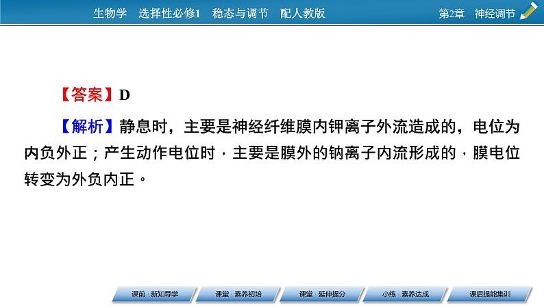 【答案】D【解析】静息时,主要是神经纤维膜内钾离子外流造成的,电位为内负外正;产生动作电位时,主要是膜外的钠离子内流形成的,膜电位转变为外负内正。