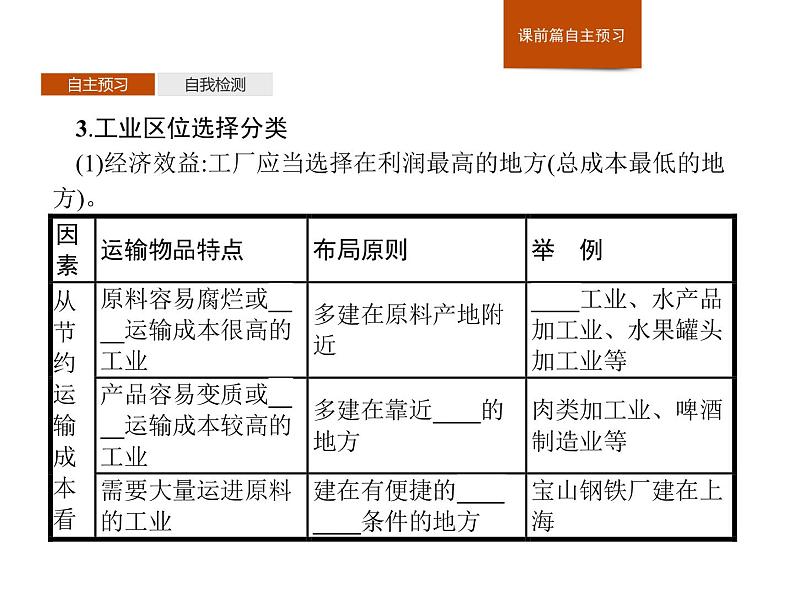 3.工业区位选择分类(1)经济效益:工厂应当选择在利润最高的地方(总成本最低的地方)。