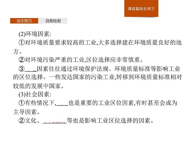 (2)环境因素:①对环境质量要求较高的工业,大多选择建在环境质量良好的地方。②对环境污染严重的工业,区位选择应非常慎重。③环境因素往往通过环境保护法规、环境质量标准等影响工业的区位选择。一些发达国家的污染工业,转移到环境质量标准相对较低的发展中国家。(3)社会因素:①有些情况下,政策也是重要的工业区位因素,有时甚至会成为主导因素。②文化、个人偏好等也是影响工业区位选择的因素。