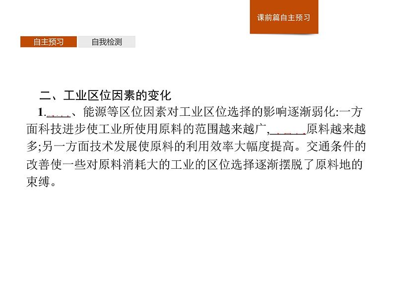 二、工业区位因素的变化1.原料、能源等区位因素对工业区位选择的影响逐渐弱化:一方面科技进步使工业所使用原料的范围越来越广,可替代原料越来越多;另一方面技术发展使原料的利用效率大幅度提高。交通条件的改善使一些对原料消耗大的工业的区位选择逐渐摆脱了原料地的束缚。