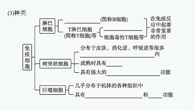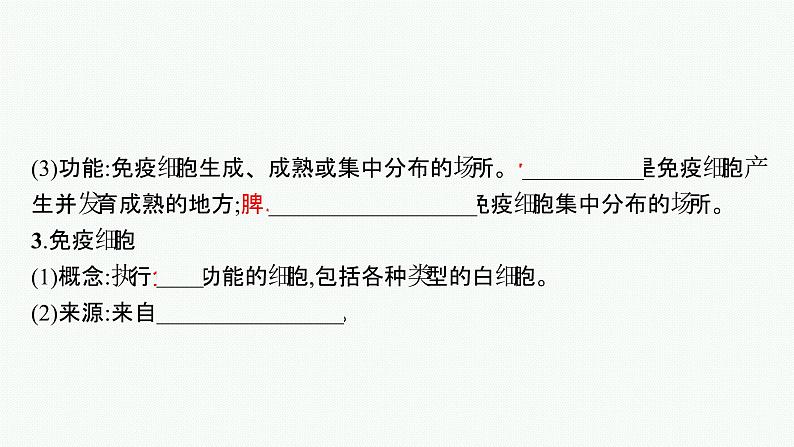 (3)功能:免疫细胞生成、成熟或集中分布的场所。骨髓和胸腺是免疫细胞产生并发育成熟的地方;脾、淋巴结和扁桃体是免疫细胞集中分布的场所。3.免疫细胞(1)概念:执行免疫功能的细胞,包括各种类型的白细胞。(2)来源:来自骨髓的造血干细胞。