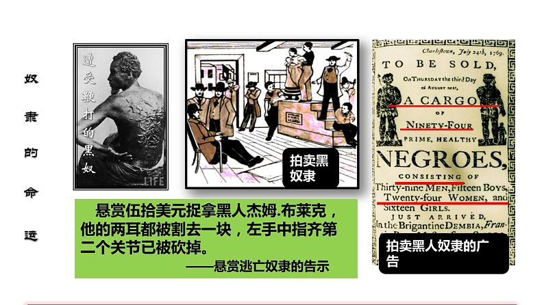 这是一份初中历史人教部编版九年级下册第一单元 殖民地人民的反抗与资本主义制度的扩展第3课 美国内战课文配套课件ppt,共24页。PPT课件主要包含了黑奴的悲惨命运,开展废奴运动,评价林肯等内容,欢迎下载使用。