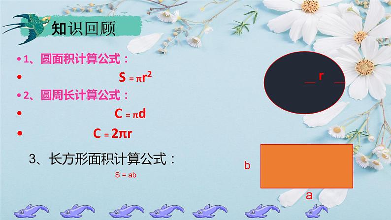 1、圆面积计算公式: S = πr22、圆周长计算公式: C = πd C = 2πr
